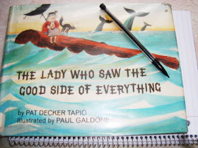 For a fun writing assignment, I pulled out a favorite children's book of mine. One I often read to Tommie when he was younger, "The Lady Who Saw the Good Side in Everything.." Today, I had him cover up the authors writings and create his own story by looking at the pictures. It was something very different for him and my reluctant writer did in fact enjoy it and actually did a decent job. I counted this as creative writing, grammar and spelling. I love it so much when we "cross-curriculum."